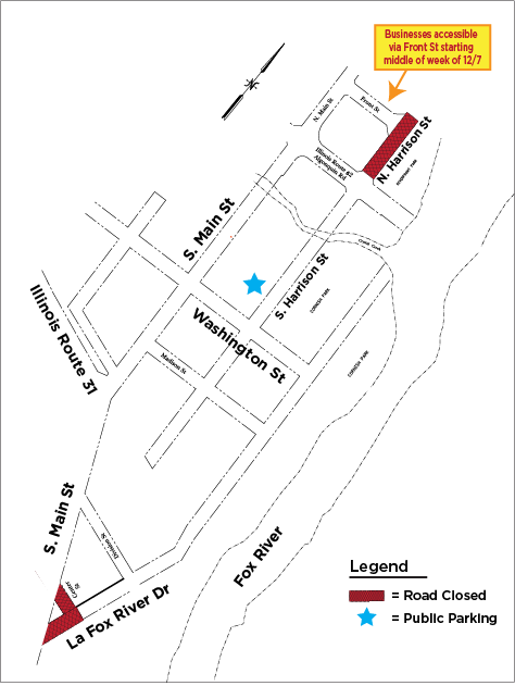 N. Harrison Street from Algonquin Road to Front Street is closed. All businesses along N. Harrison Street between Front and Edward streets are open and accessible from Edward Street. During the middle of next week, access to businesses will be switched to Front Street.
